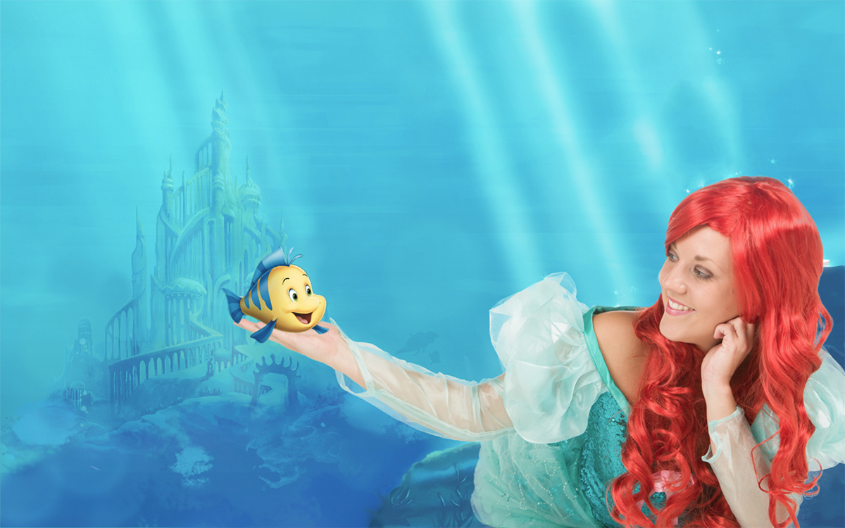 The Little Mermaid wears her land ball gown of shimmering green and loves to talk about her life under the sea. The Little Mermaid can be accompanied by her loyal friend Sebastian the dancing crab.